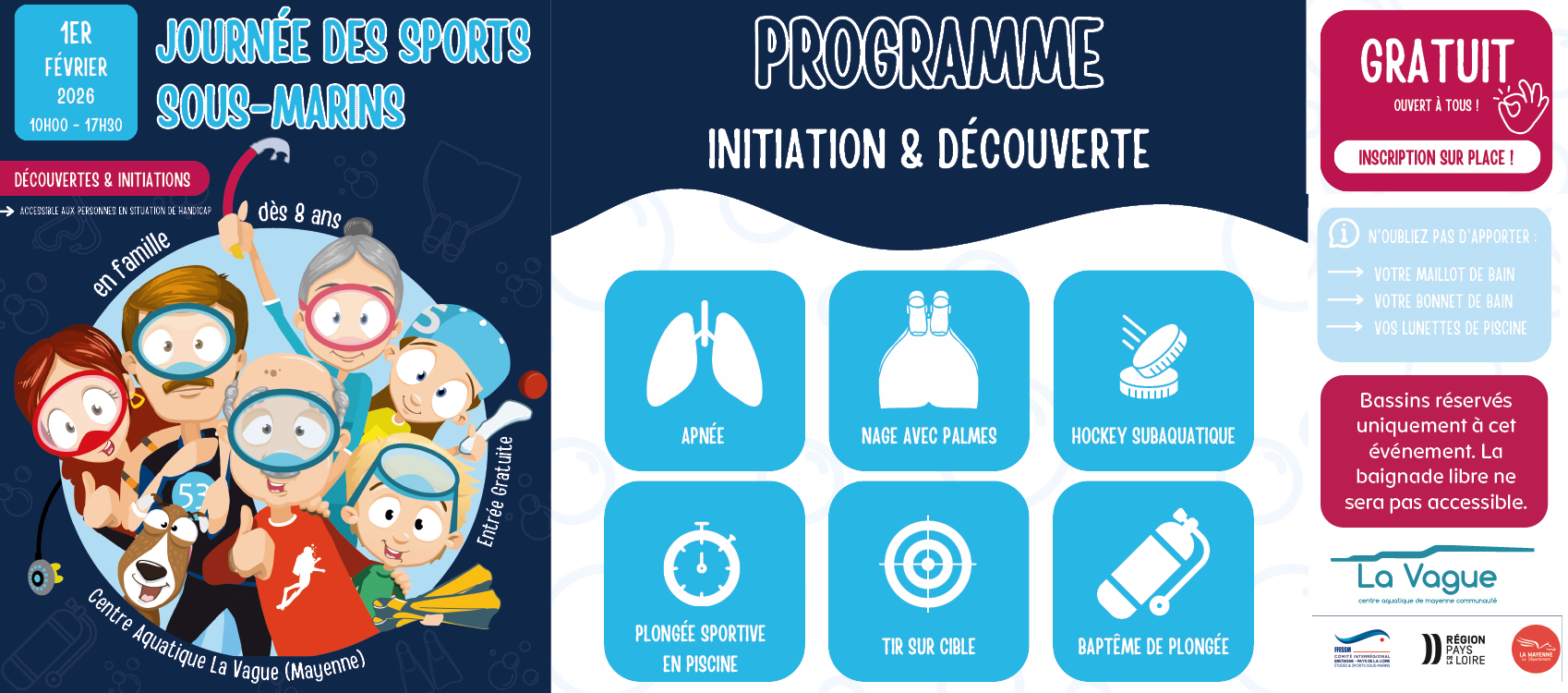 Le Comité Interrégional Bretagne – Pays de la Loire d’Etudes et de Sports Sous-Marins organise une grande Journée des Sports Sous-Marins le dimanche 1er février 2026 au Centre Aquatique La Vague à Mayenne. Cet événement, gratuit et ouvert à tous dès 8 ans, invite le public à découvrir de nouvelles sensations. Au programme de cette journée (10h00 – 17h30) : Sensations :Baptêmes de …